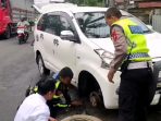 Tampak dua anggota Polantas saat melaksanakan patroli berhenti ketika melihat seorang pengendara yang mendapat masalah karena ban mobilnya bocor.
