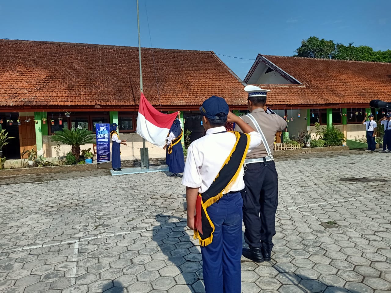 Bertepatan dengan hari Senin, Satlantas Polres Trenggalek menerjunkan sejumlah personelnya untuk bertindak sebagai pembina upacara bendera, Salah satunya di SMP 2 Karangan, Kabupaten Trenggalek. Senin, (21/10).