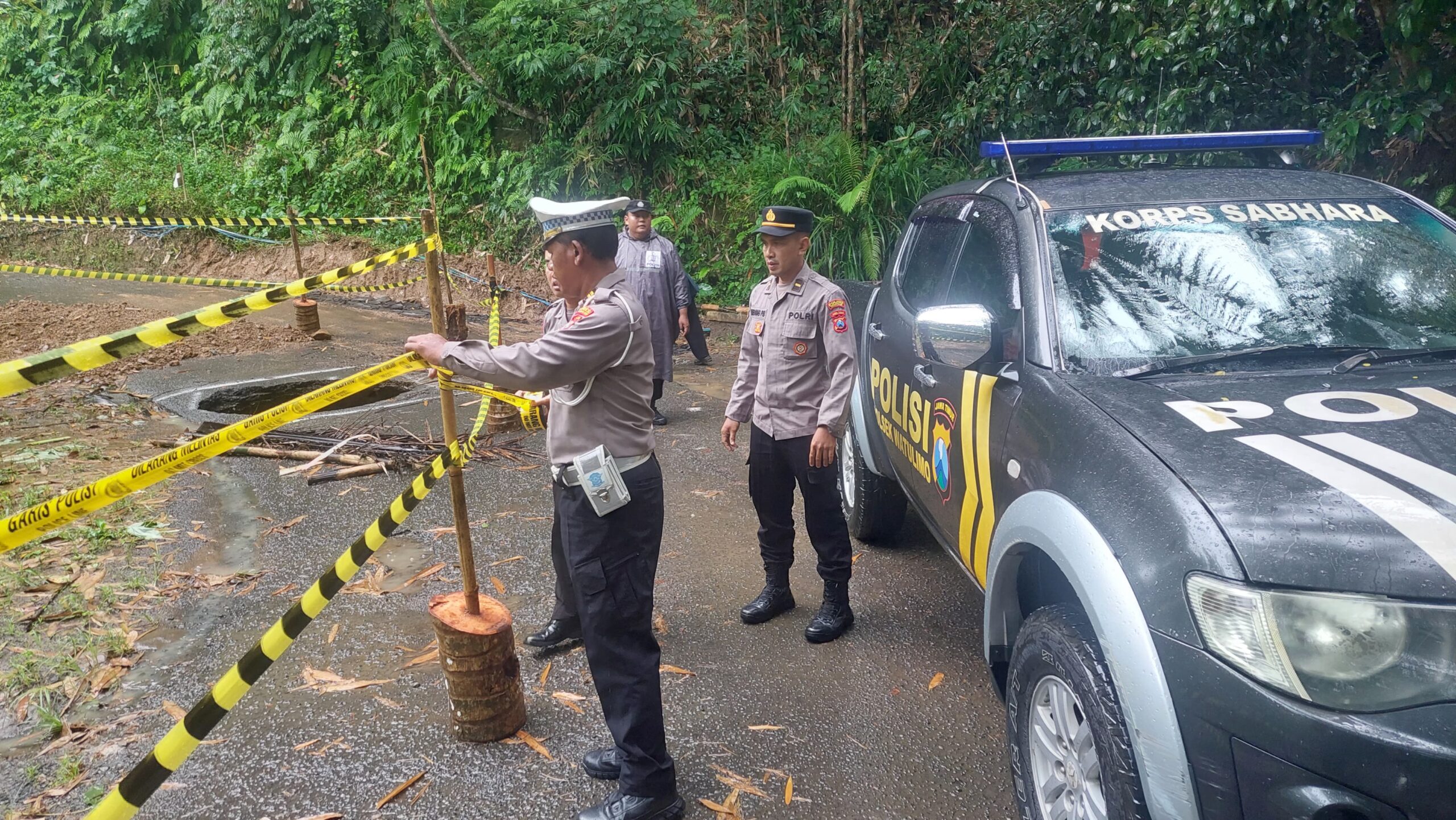 Guna mengantisipasi terjadinya kecelakaan lalu lintas, jajaran kepolisian dari Satlantas Polres Trenggalek bersama Polsek Watulimo memasang tanda peringatan dan police line disepanjang jalur penghubung antar kecamatan tersebut.