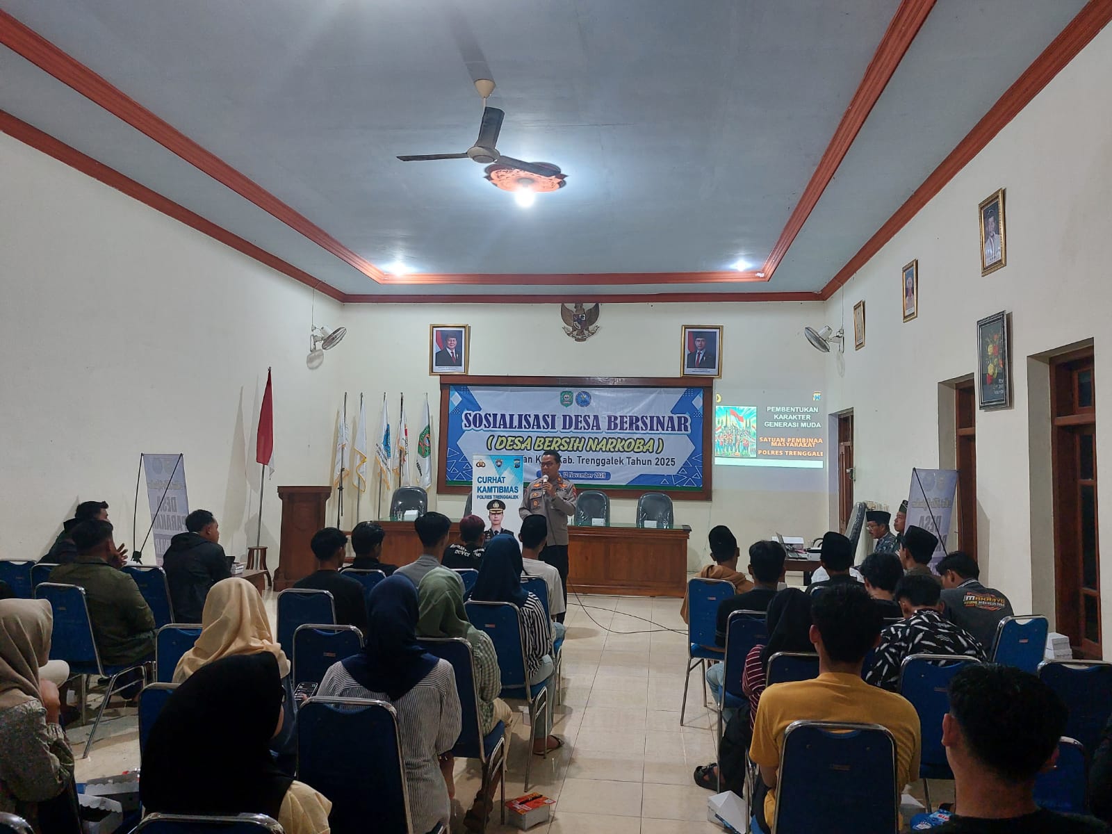 Polres Trenggalek – Jajaran kepolisian turut andil dalam menjaga generasi muda Trenggalek agar terhindar dari bahaya penyalahgunaan Narkoba. Berkolaborasi bersama BNNK Trenggalek, kepolisian melalui Satbinmas turut menjadi salah satu nara sumber utama dalam sosialisasi Desa Bersinar (Desa Bersih Narkoba).