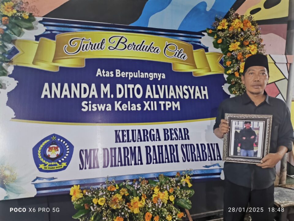 Surabaya, jatimterkini – Sembari berucap lirih dengan tatapan mata yang sayu dan berkaca-kaca, seolah tak kuasa menahan kepiluan yang dialaminya, Achmad Tony Suliono, Ayah Muhammad Dito Alviansyah (19), pelajar SMK yang ditemukan tewas bersama M Fahmi temannya yang mengalami luka serius di Jalan Sukomanunggal Jaya masih menjadi misteri.