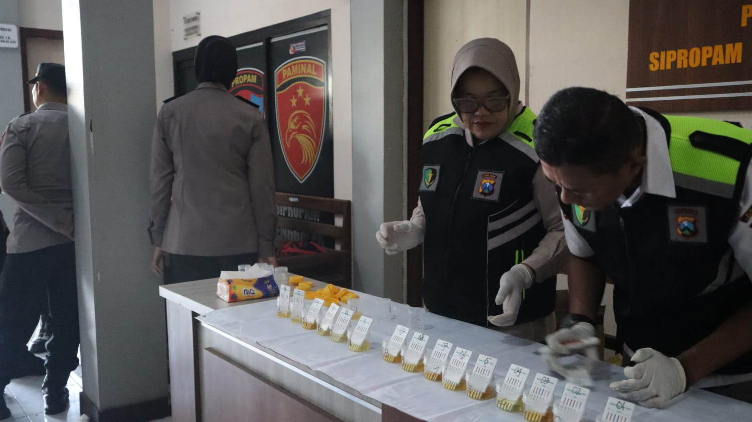 Selesai apel pagi, seluruh perwira diminta untuk merapat ke lorong gedung utama Mapolres tepatnya didepan ruang Sipropam. Setelah didata dan absensi, seluruh perwira diperintahkan untuk mengambil urine masing-masing ke tempat yang telah disediakan.