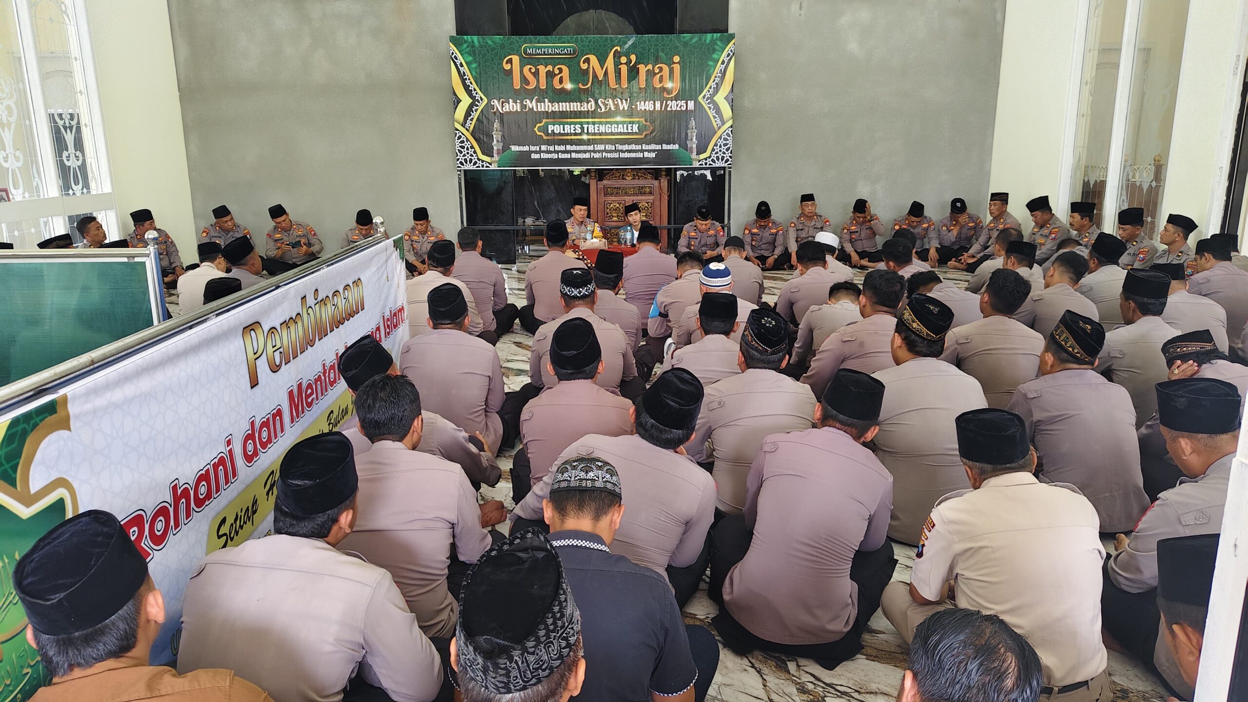 Polres Trenggalek – Ratusan anggota Polres Trenggalek nampak khidmat mengikuti peringatan Isra Miraj Nabi Muhammad SAW. Dalam acara yang digelar di masjid Baitul Muttaqin Mapolres Trenggalek ini dihadiri oleh seluruh personel Polres maupun perwakilan Polsek jajaran. Kamis, (30/1).