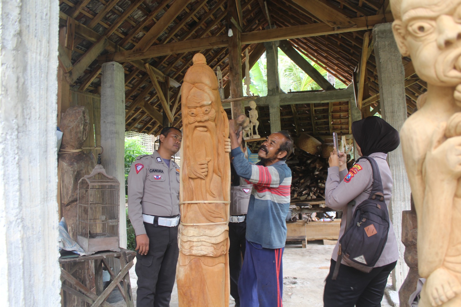 Seperti halnya yang dilakukan oleh sejumlah Polantas Polres Trenggalek ini. Di tengah kesibukannya saat menggelar Polbindes di desa Jajar Kecamatan Gandusari, Kabupaten Trenggalek masih menyempatkan diri berkunjung ke galeri sekaligus rumah seorang seniman pahat yang cukup dikenal tidak hanya di Trenggalek tetapi juga hingga luar kota. Selasa, (9/7).