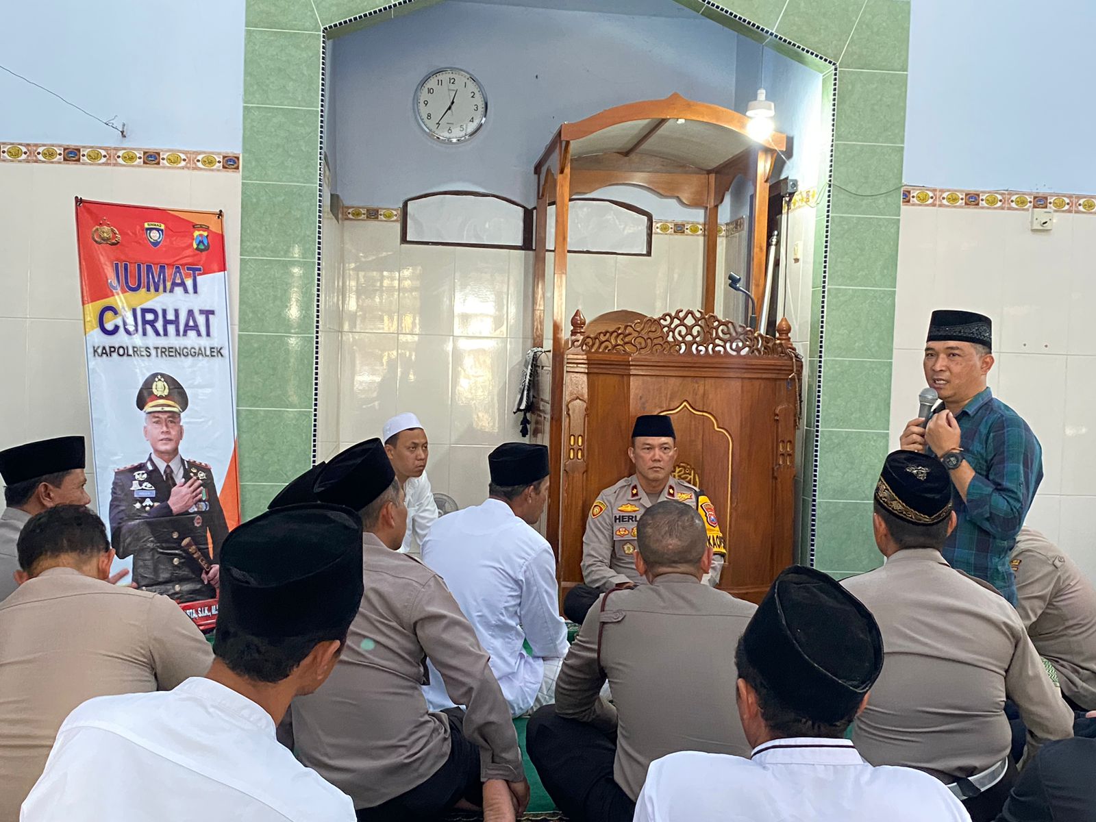 Kali ini, Jumat Curhat Polres Trenggalek digelar di Masjid Al Ikhlas Kelurahan Keluta, Kabupaten . Trenggalek. Usai melaksanakan ibadah salat Jumat berjamaah, petugas kepolisian berbincang santai dengan jemaah sembari mendengarkan keluhan dan masukan dari masyarakat. Jumat, (23/8).