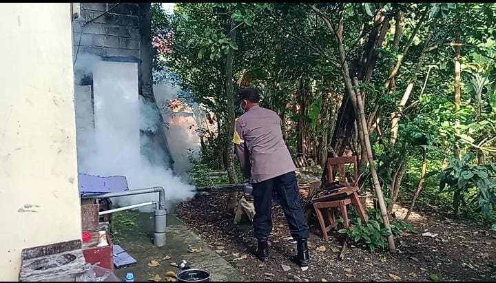 Polres Trenggalek – Bhabinkamtibmas bersama tiga pilar dan petugas Puskesmas desa Wonocoyo Kecamatan pogalan, Kabupaten Trenggalek kompak menggelar fogging atau pengasaban di sejumlah titik. Selasa, (14/1).