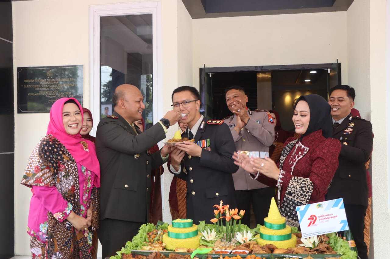 Kapolres Trenggalek AKBP Ridwan Maliki, S.H., S.I.K., M.I.K., yang baru saja selesai mengikuti upacara Hari Bhayangkara di Alun-alun Trenggalek menyambut hangat kedatangan Dandim 0806 bersama sejumlah pejabat utama.