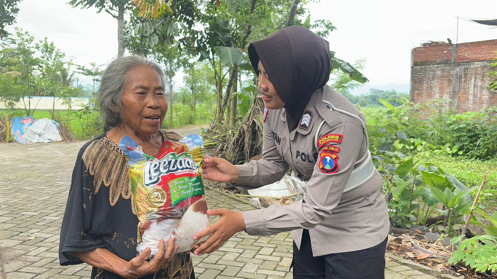 Tak sebatas di lingkar jalan protokol, personel kepolisian yang merupakan anggota dari Satlantas Polres Trenggalek ini bahkan sampai blusukan ke jalan-jalan desa. Sembari berkeliling, para Polwan nampak membagikan beras berukuran 5 Kg, kepada warga yang ditemuinya.
