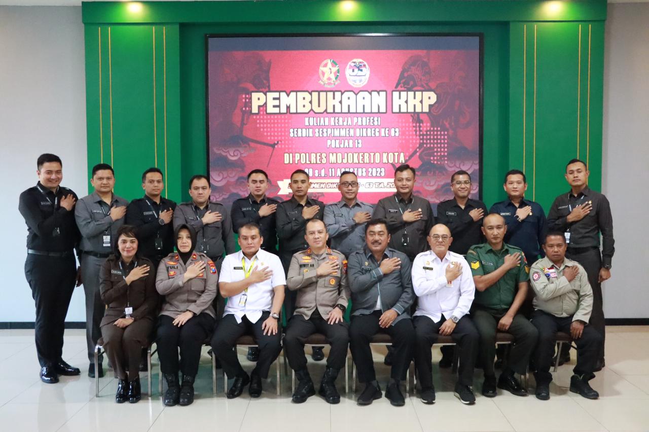 Mojokerto –Polresta Mojokerto Kembali dipercaya sebagai tempat kegiatan Kuliah, Kerja dan Profesi (KKP) yang dilaksanakan 12 personil Sekolah Staf dan Pimpinan Menengah (Sespimmen) Digreg ke 63 Pokjar 13, Kapolresta Mojokerto AKBP Wiwit Adisatria , S.H., S.I.K, M.T. membuka kegiatan yang diikuti 12 personil Sekolah Staf dan Pimpinan Menengah (Sespimmen) Pokjar 13 di Aula Wira Pratama Mapolresta Mojokerto, Rabu (09/08/23)